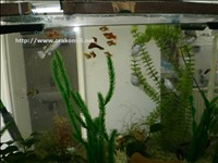 some plastic plants mixed with natural. i added the plastic plants not just for decoration but for two more reasons: first is to give some more hiding space for new born sward-tails. second is to give the puffers places to make their own territory since they are extremely aggressive to other fish and one to each other (especialy if they are hungry)